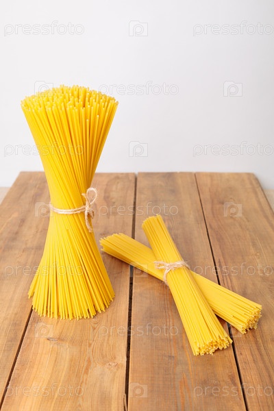 Вертикальный пучок и куча сырых спагетти, перевязанных ниткой. Связка на деревянном фоне