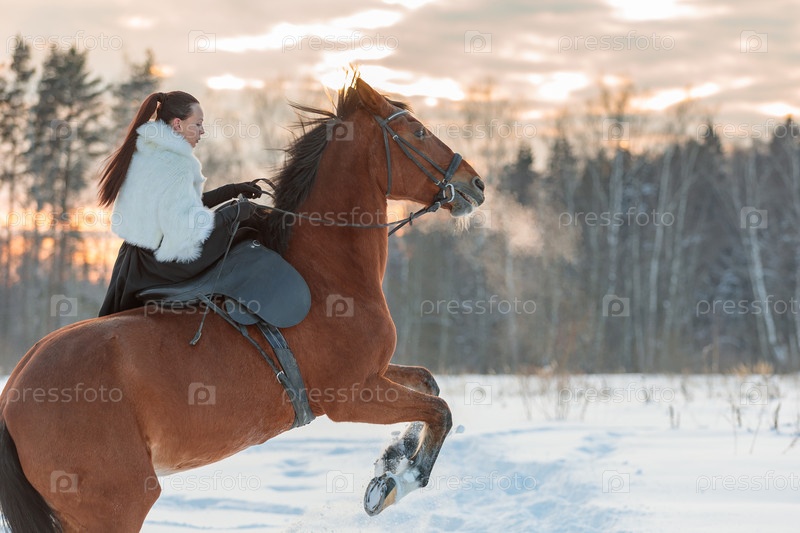 Девушка в белом плаще едет зимой на коричневой лошади. Золотой час, заходящее солнце