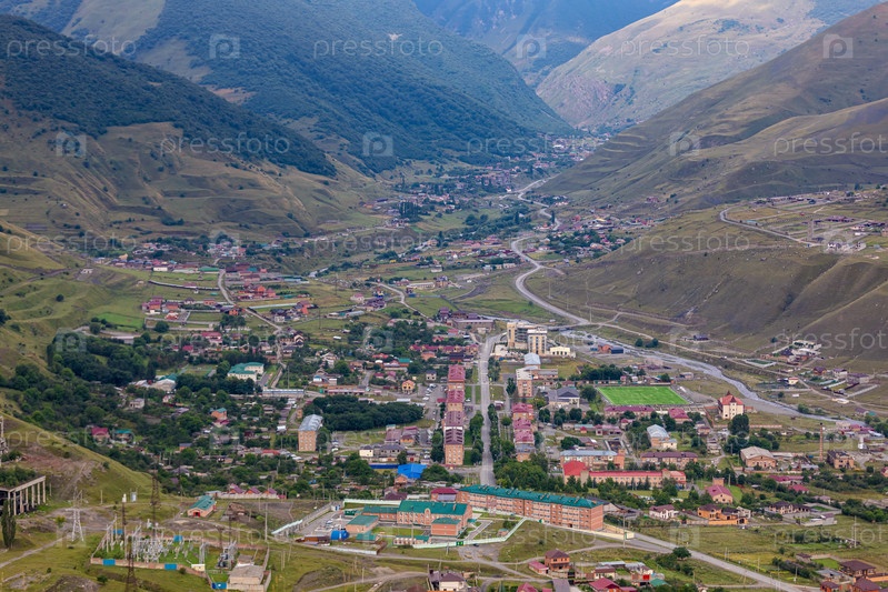 Горный пейзаж с городом на дне ущелья. Верхний Фиагдон в Северной Осетии
