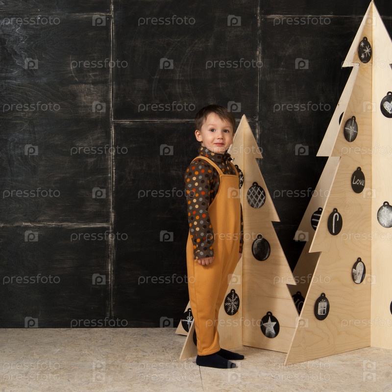 Маленький мальчик рядом с декоративными елками