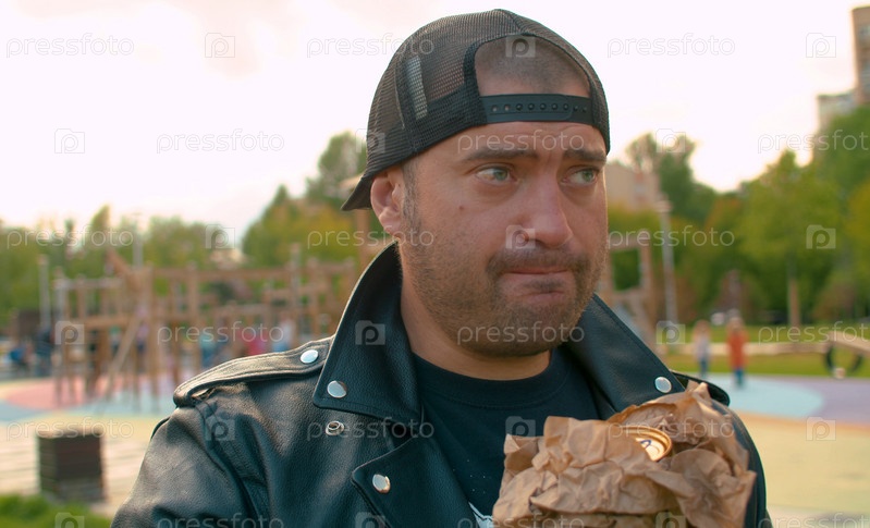 Портрет хулигана в байкерской куртке, незаконно пьющего пиво на детской площадке