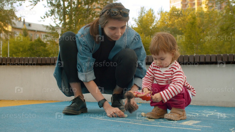 Молодая женщина играет с маленькой девочкой на детской площадке