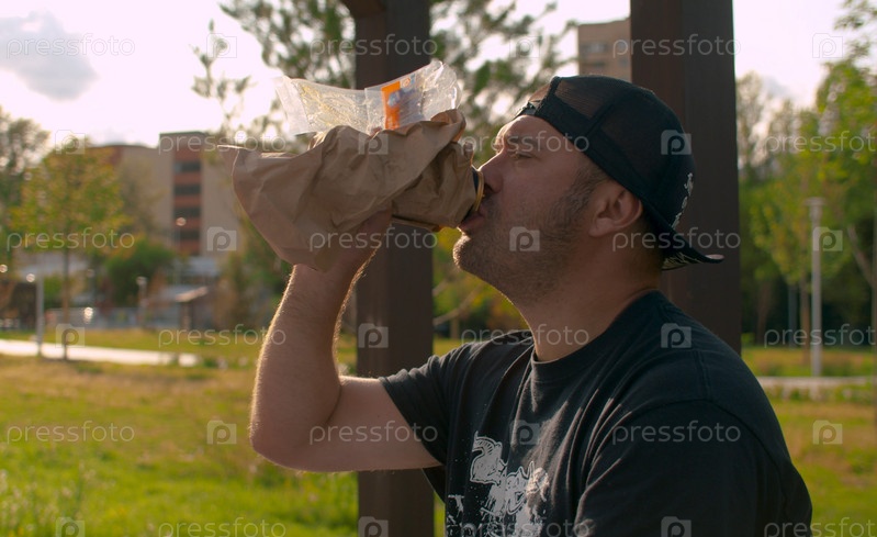 Портрет брутального мужчины, незаконно пьющего пиво в парке. Он положил банку пива в бумажный пакет, чтобы полиция не заметила, что он пьет