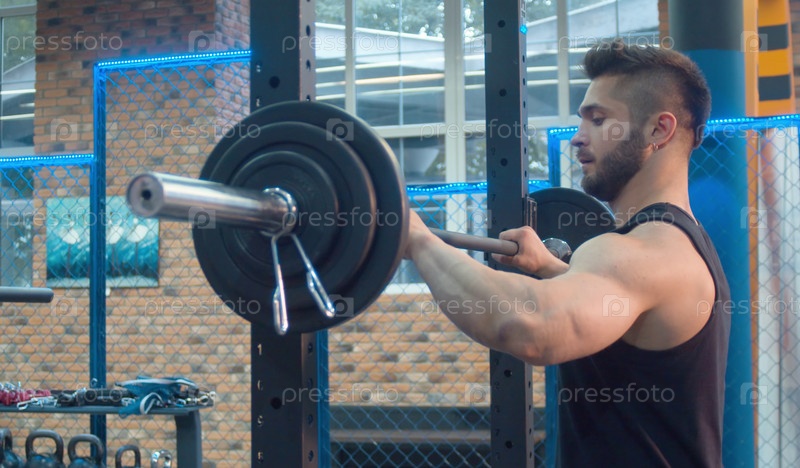 Спортсмен перед подъемом штанги. Бодибилдер в тренажерном зале