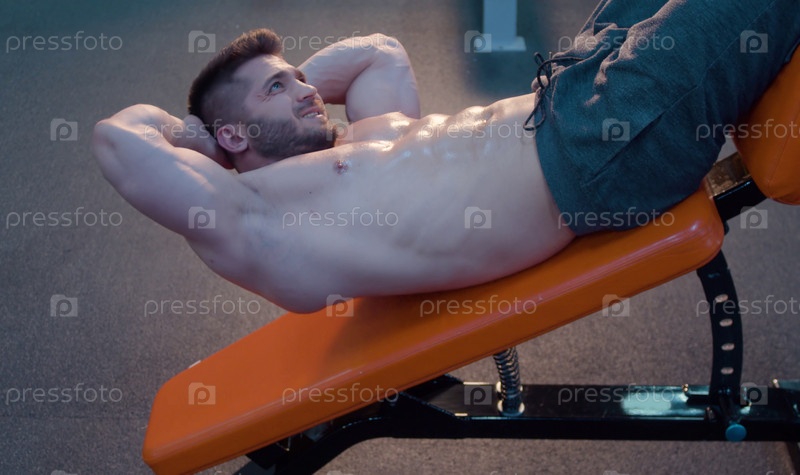 Сильный бодибилдер делает упражнения на пресс в спортзале