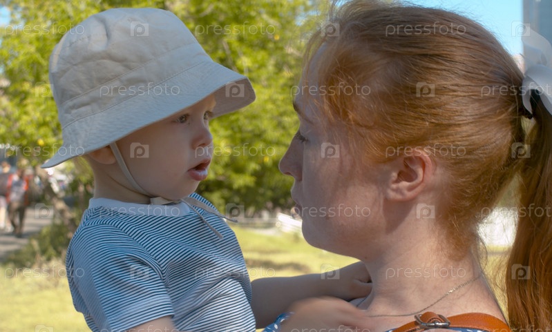 Мама и ее сын в парке. Женщина держит ребенка на руках