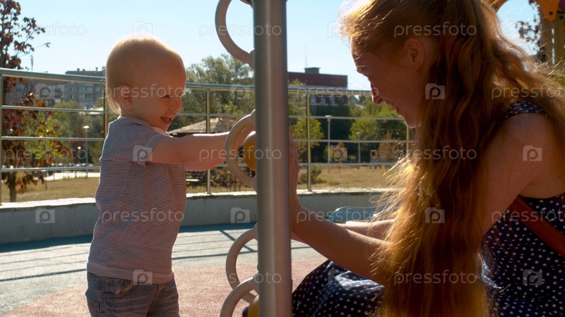 Мама играет с маленьким мальчиком в парке на детской площадке