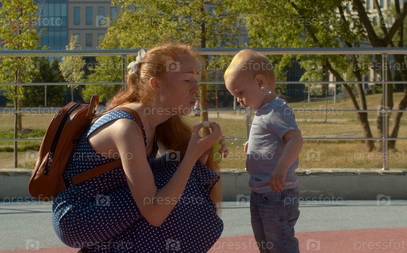 Мама пускает мыльные пузыри, маленький мальчик смотрит на них. Летний день в парке