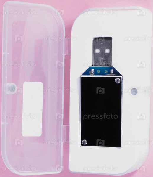 Электронное устройство в пластиковом корпусе на розовом фоне днем