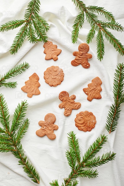 Рождественские пряники на текстильном фоне. Подготовка к зимним каникулам. Вид сверху, плоская планировка