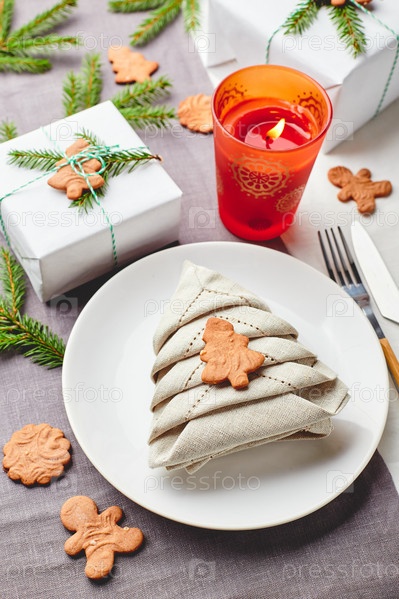 Рождественская праздничная сервировка стола, салфетка в виде елки на тарелке на белой скатерти с подарками и украшениями с еловыми веточками и пряниками