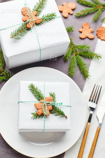 Рождественская праздничная сервировка, тарелка с подарком, украшенная еловыми веточками и пряниками на фоне светлой ткани