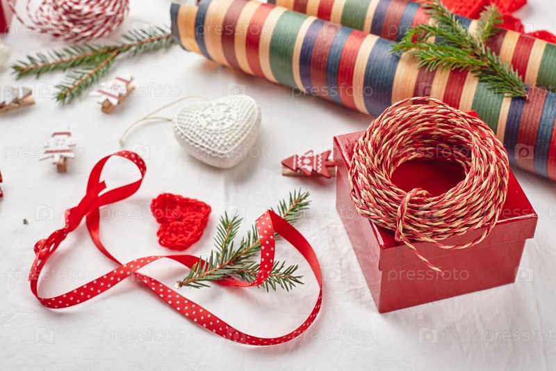 Новогодний фон с подарочными коробками, лентой, шпагатом, рулонами бумаги, вязаными сердечками и рождественским орнаментом