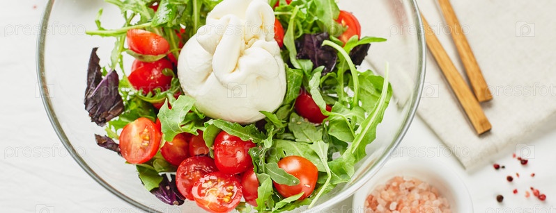 Буррата, итальянский свежий сыр из сливок и буйволиного или коровьего молока, с помидорами, рукколой и салатом из красного базилика