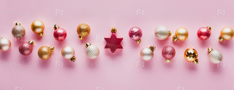Много новогодних шаров розового и золотого цвета