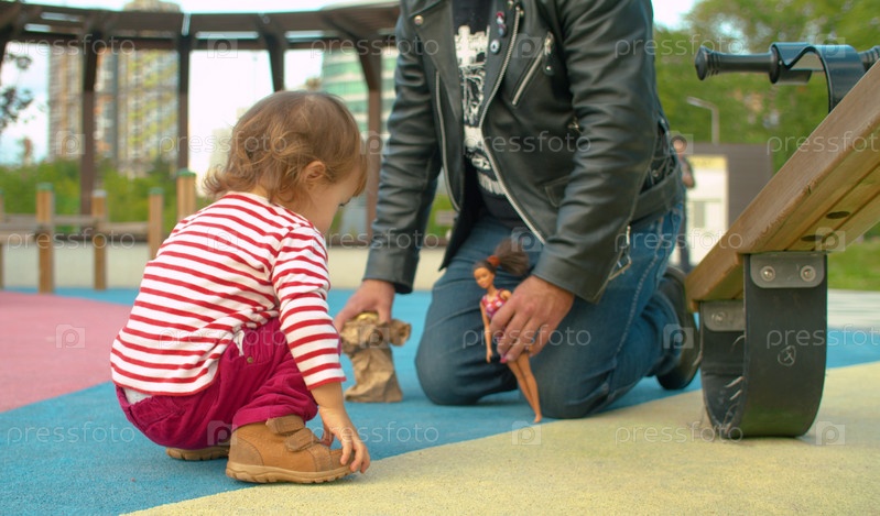 Отец-хулиган с банкой пива в руках играет с маленькой дочерью. Забавный ребенок на детской площадке