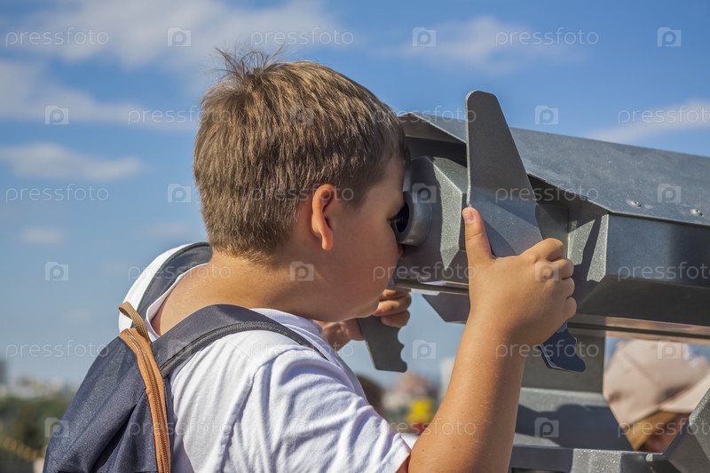 Мальчик смотрит в бинокль со смотровой площадки. Путешествие