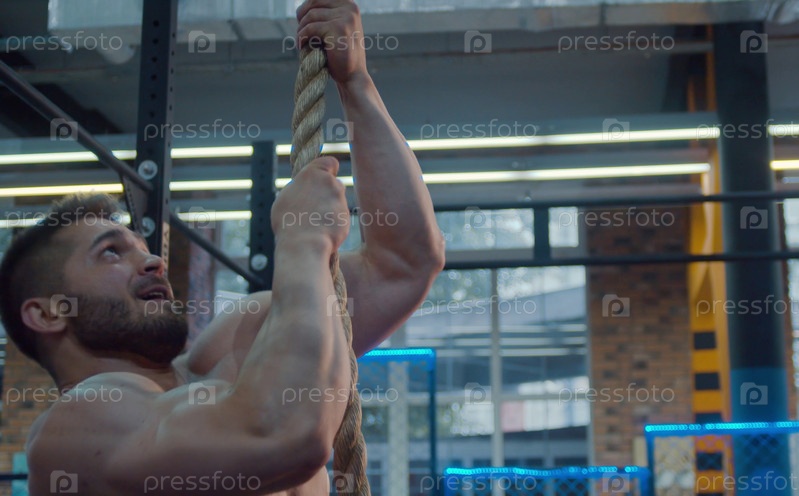 Мужчина-спортсмен взбирается по канату. Бодибилдер в тренажерном зале