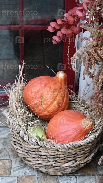 Тыквы в плетеной корзине у дверей кафе как украшение на Хэллоуин
