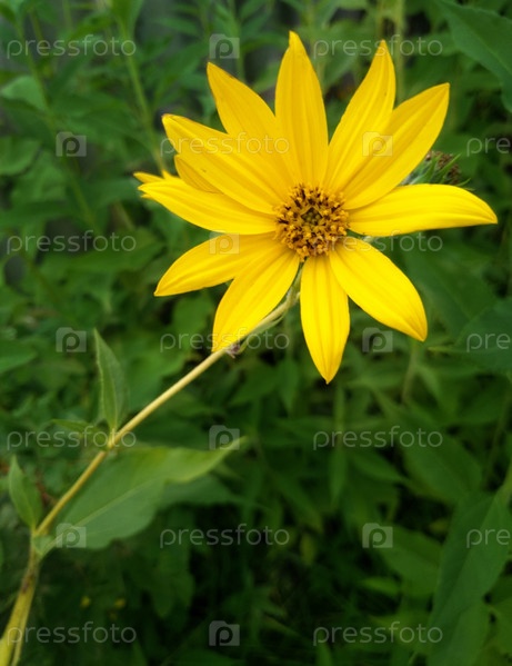 Желтый цветок топинамбура осенью на размытом фоне из зеленых листьев