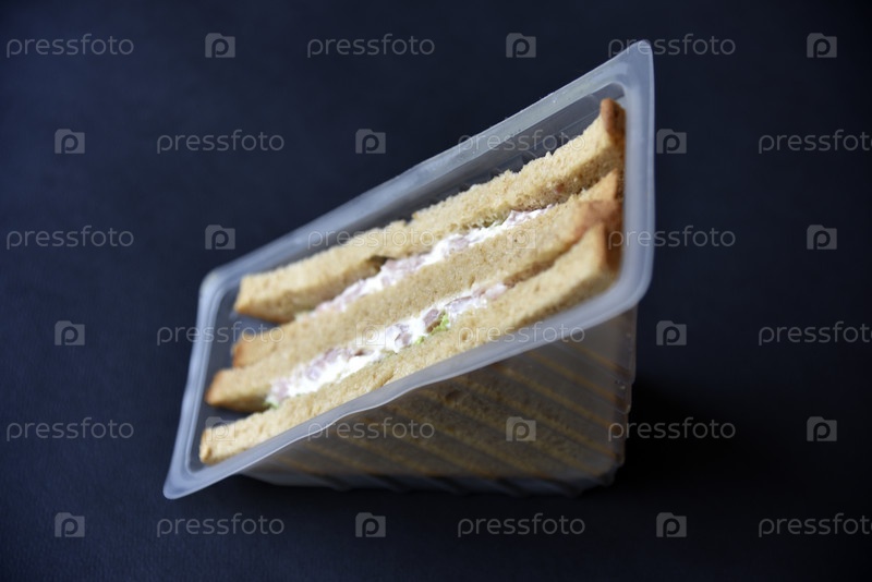 Вкусные бутерброды в пластиковой упаковке крупным планом на черном фоне. Вкусный завтрак в упаковке