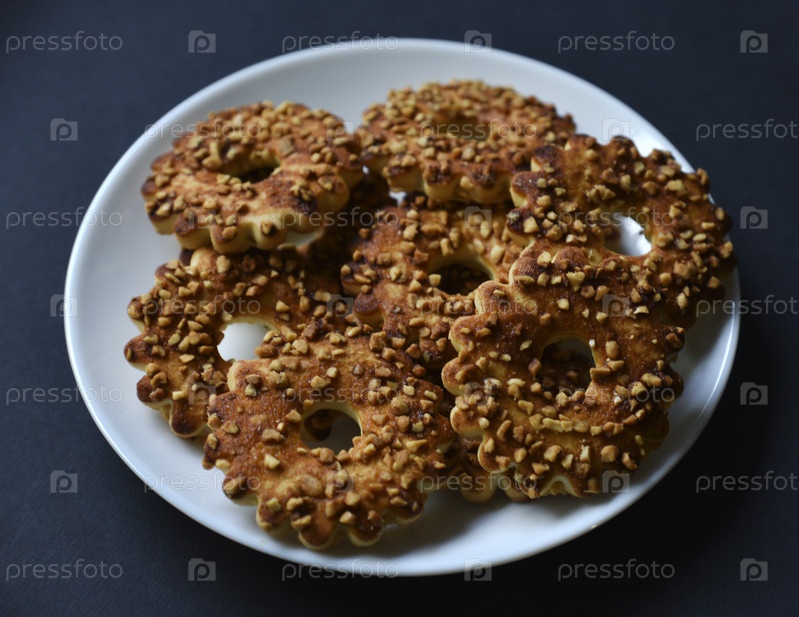Вкусное печенье с орехами на белой тарелке на черном фоне. Вкусный завтрак из сладкого печенья
