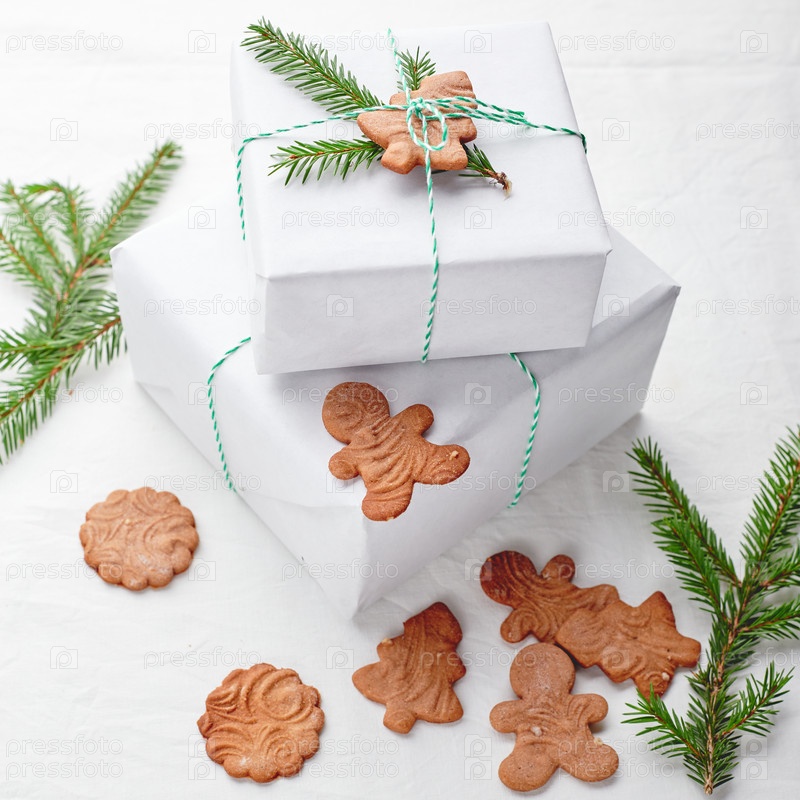 Рождественские подарки, завернутые в белую бумагу и украшенные еловыми веточками и пряниками на фоне ткани