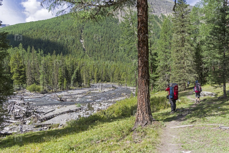 Туристы на тропе, идущей по берегу реки Шавла, между Шавлинскими озерами и устьем реки Ештыкол. Август.Горный Алтай
