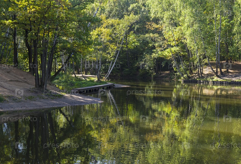 Пруд в ландшафтном заказнике Теплый Стан, Москва, Россия. Отражение деревьев в воде. Солнечный день в сентябре
