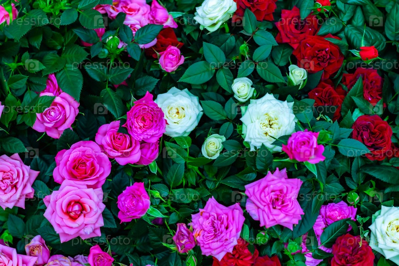 Свежий разноцветный розовый фон. Много красочных ярких роз крупным планом. крупным планом