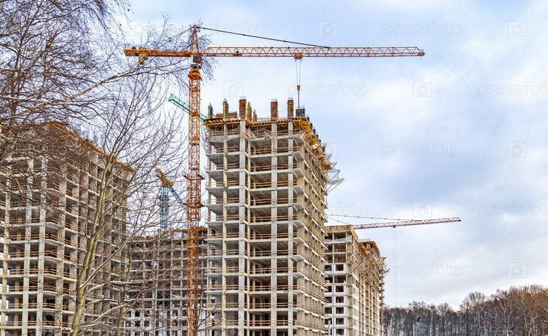 Строительство третьей очереди нового жилого комплекса «В лесу». Работа строительных кранов, идет возведение стен зданий. Москва, Россия