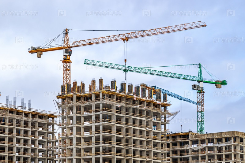 Строительство третьей очереди нового жилого комплекса «В лесу». Работа строительных кранов, идет возведение стен зданий. Москва, Россия