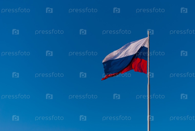 Государственный флаг России на флагштоке развевается ветром на фоне голубого неба. Россия
