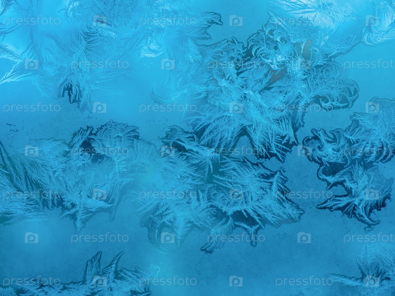 Красивый рождественский морозный узор с белыми снежинками на синем фоне на окне