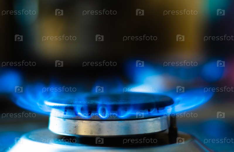 Горелка газовой плиты с синим пламенем крупным планом