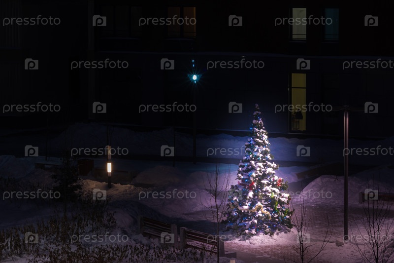 Празднично украшенная елка во дворе многоэтажного жилого дома. Москва, Россия