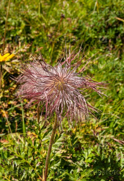 Плод альпийской ветрянки Pulsatilla alpina apiifolia растет на живописных алпийских лугах.Гриндельвальд, Швейцария