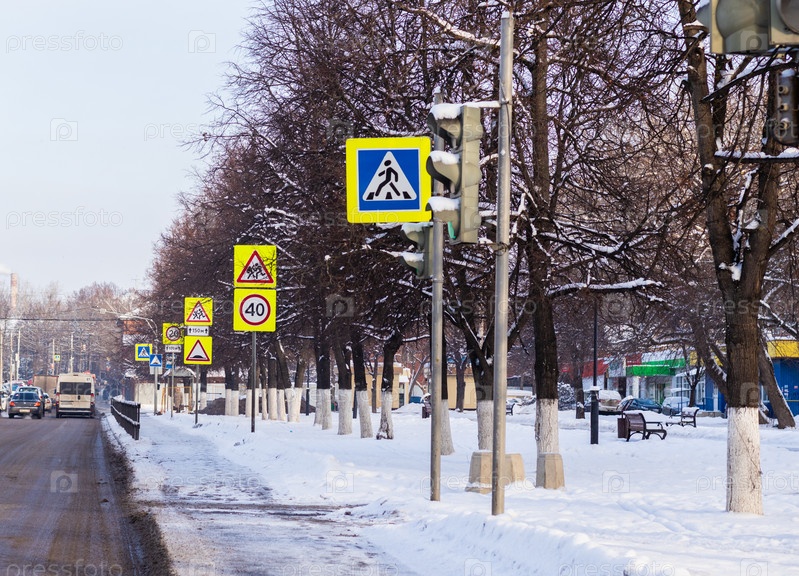 Предупреждающий дорожный знак. Зимняя дорога в городе. Тула, Россия