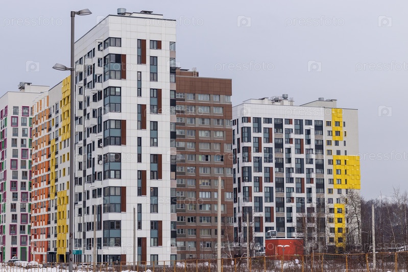 Современный многоквартирный дом с красочными фасадами на окраине города. Москва, Россия