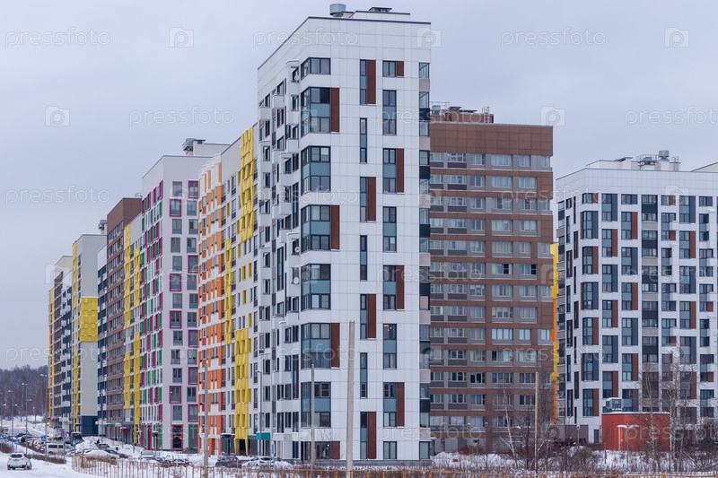 Современный многоквартирный дом с красочными фасадами на окраине города. Москва, Россия