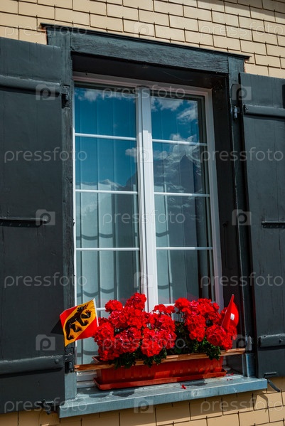Красивые окна с цветами и ставнями. Альпы Швейцарии