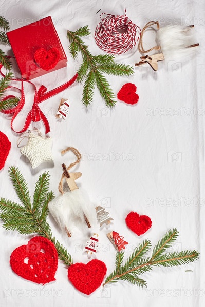 Новогодний фон с подарочными коробками, лентой, шпагатом, рулонами бумаги, вязаными сердечками и рождественским орнаментом