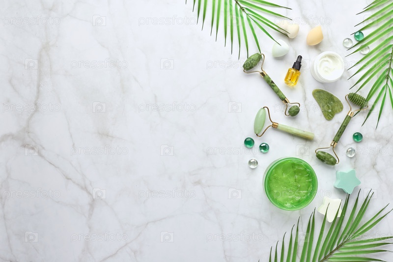 Косметические средства по уходу за кожей, массажер для лица с нефритовым камнем, кремы, гель и масло. Роликовый массаж лица. Плоская планировка, вид сверху