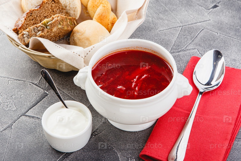 Украинский и русский национальный красный борщ со сметаной и зеленью