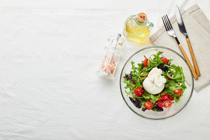 Буррата, итальянский свежий сыр из сливок и буйволиного или коровьего молока, с помидорами, рукколой и салатом из красного базилика