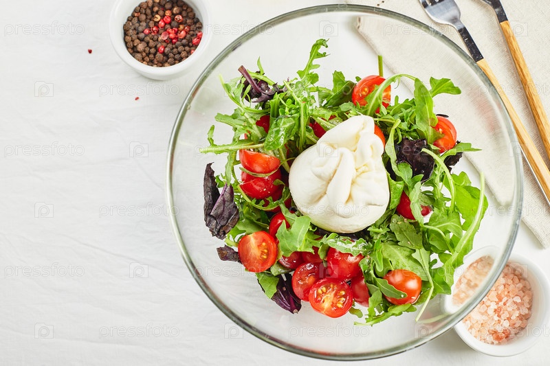 Буррата, итальянский свежий сыр из сливок и буйволиного или коровьего молока, с помидорами, рукколой и салатом из красного базилика