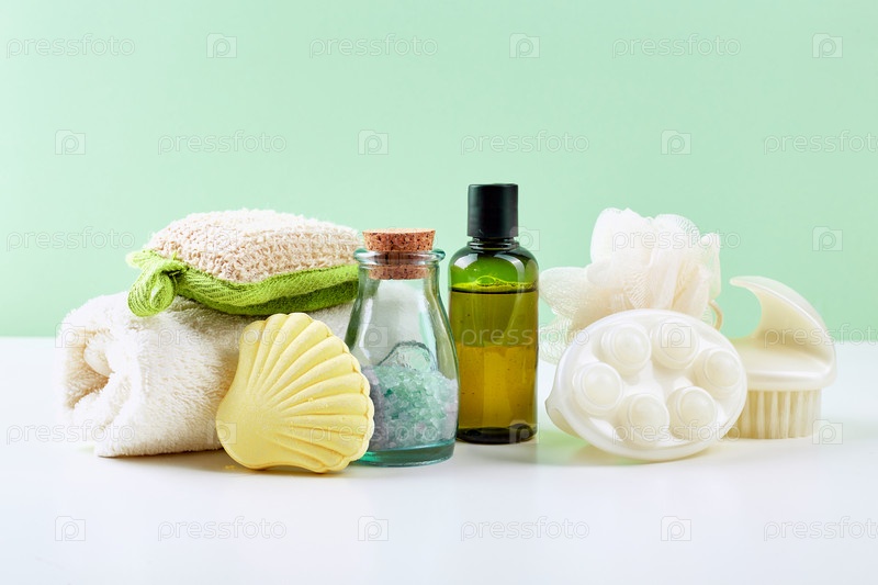Аксессуары для ванной комнаты - шампунь, мочалка, полотенце, соль для ванны и щетка для тела