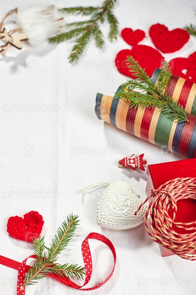 Новогодний фон с подарочными коробками, лентой, шпагатом, рулонами бумаги, вязаными сердечками и рождественским орнаментом. Подготовка к зимним каникулам. Вид сверху, плоская планировка