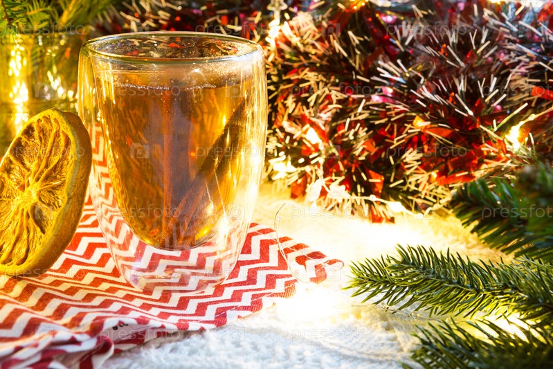 Прозрачный стеклянный стакан с двойными стенками с горячим чаем и палочками корицы на столе с рождественским декором. Новогодняя атмосфера, ломтик сушеного апельсина, гирлянда и мишура, еловая ветка, уютно