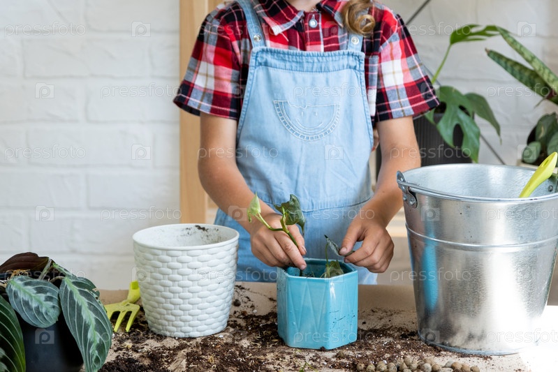Девушка пересаживает комнатное растение филодендрон в новую почву с дренажем. Уход за горшечными растениями, полив, подкормка, вручную посыпать смесью совком и утрамбовать в горшке. Хобби и окружающая среда